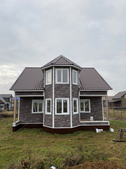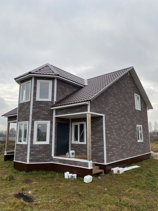 Материал стен — СИП панели европейского завода «ЭкоЕвроДом» г. Москва; с отделкой: пол ламинат, стены – обои, потолки натяжные; наружная отделка хауберк; кровля – металлочерепица, окна ПВХ двухкамерные, межэтажная лестница деревянная.
