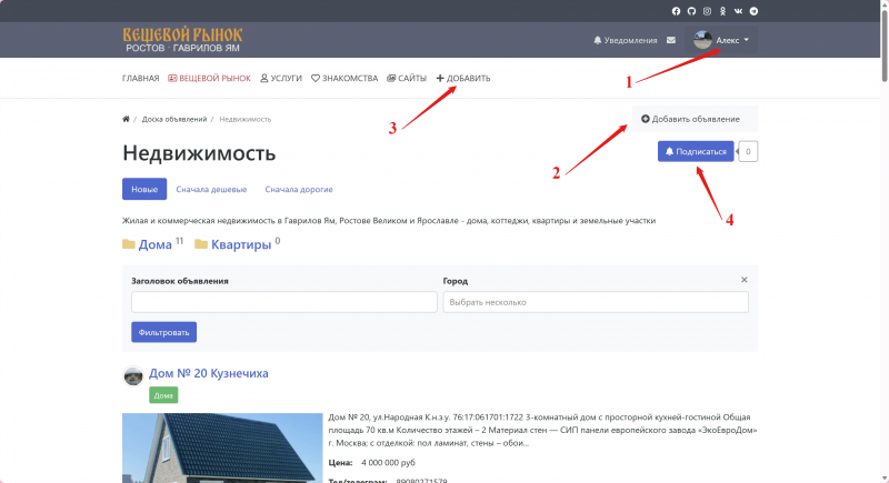 Не забудьте подписаться на нужные разделы (см. 4 на рис), чтобы не пропустить новые объявления и комментарии.